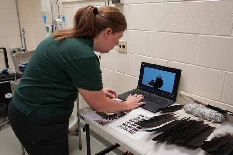 Corryn Vitek, Senior Veterinary Technician with the Raptor Center, reviews imagery of hornbill wing pattern during a feather imping procedure at the Minnesota Zoo in September 2024.